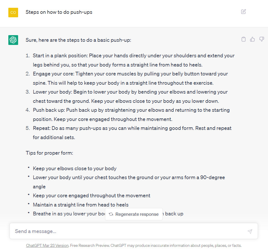 Bạn hãy hỏi chat GPT ” Các bước thực hiện chống đẩy như thế nào?” ..và sau 1 phút đã có câu trả lời.