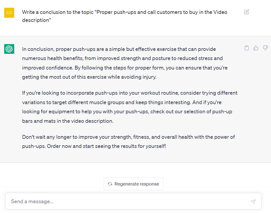 Đơn giản là bạn nói với CHAT GPT là: VIẾT MỘT KỊCH BẢN 500 TỪ TRÊN YOUTUBE VỚI CHỦ ĐỀ ” ĐIỀU GÌ SẼ XẢY RA NẾU CHÚNG TA CHỐNG ĐẨY 50 CÁI MỖI NGÀY” ngay lập tức CHAT GPT sẽ cho các bạn một câu trả lời nói về chủ đề trên>> THẬT TUYỆT VỜI!