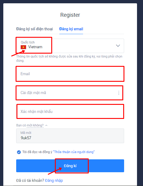 Sau đó chọn “Đăng ký email” rồi nhập các thông tin mà Huobi yêu cầu. Tích chọn “Tôi đã đọc và đồng ý” và bấm vào “Đăng ký”. Một mã xác minh sẽ được gửi qua email của bạn, hãy chọn “Xác nhận” để đăng ký tài khoản Huoni thành công.