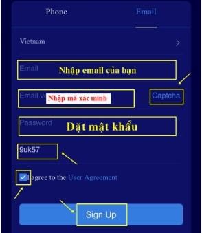 Trên màn hiện sẽ hiện ra bảng các thông tin cần nhập gồm địa chỉ email, mã xác minh email (sẽ được gửi qua email khi nhấp vào “Captcha” và đặt mật khẩu. Tiếp tục chọn “I agree to the User Agreement”và nhấp “Sign Up” để tạo tài khoản