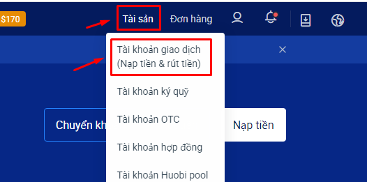 Để nạp tiền vào Huobi, hãy di chuyển chuột đến phần “Tài sản” rồi chọn “Tài sản giao dịch”.