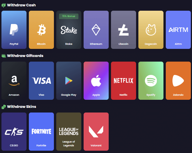 Bạn cũng có tùy chọn chuyển đổi xu của mình thành thẻ quà tặng Amazon, AirTM, hoặc các thẻ quà tặng khác, và ở một số quốc gia, bạn còn có thể nhận thanh toán qua chuyển khoản ngân hàng.