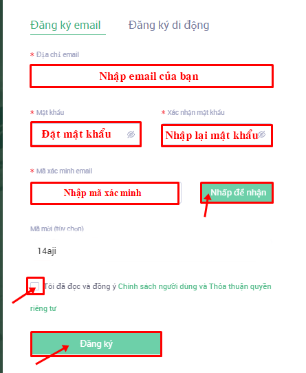 Sau đó bạn nhập địa chỉ email và đặt mật khẩu, nhập lại mật khẩu và chọn “Nhấp để nhận” để nhận mã xác minh qua Email, sau đó nhập mã xác minh và chọn “Tôi đã đọc và đồng ý”, cuối cùng chọn “Đăng ký” để tạo tài khoản