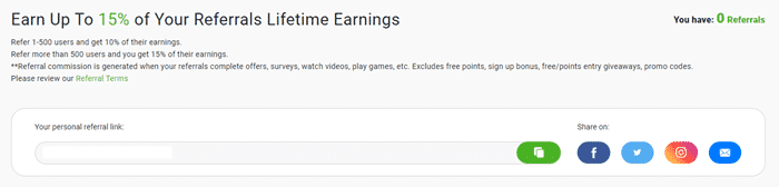 Bạn có thể tham gia chương trình giới thiệu để kiếm thêm điểm. Nếu bạn chưa quen với chương trình giới thiệu, đây là một chương trình thưởng được thiết kế để quảng bá trang web.