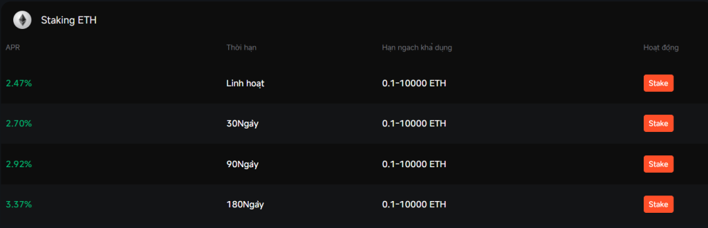 - Cách 3. Staking ETH hưởng lãi lên tới 3.37% trong 180 ngày. Dành cho những khách hàng đã xác thực KYC cấp độ 2. > Xem thêm<<