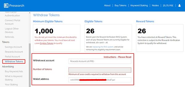 Sau khi kiếm tiền được, điều mà chúng ta quan tâm chính là làm thế nào để rút tiền về ví? Thông thường PRE coin được lưu ở hai tài khoản: Một là tài khoản phần thưởng (Rewards Account) và tài khoản tiết kiệm (Saving Account). Nếu bạn tham gia kiếm tiền PRE miễn phí thì sẽ rút ở tài khoản Rewards. Và số tiền tối thiểu là 1000 PRE.