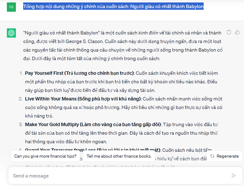 Bước 1: Tạo nội dung SÁCH bằng CHAT GPT qua câu lệnh: “Tổng hợp nội dung những ý chính của cuốn sách: Người giàu có nhất thành Babylon”